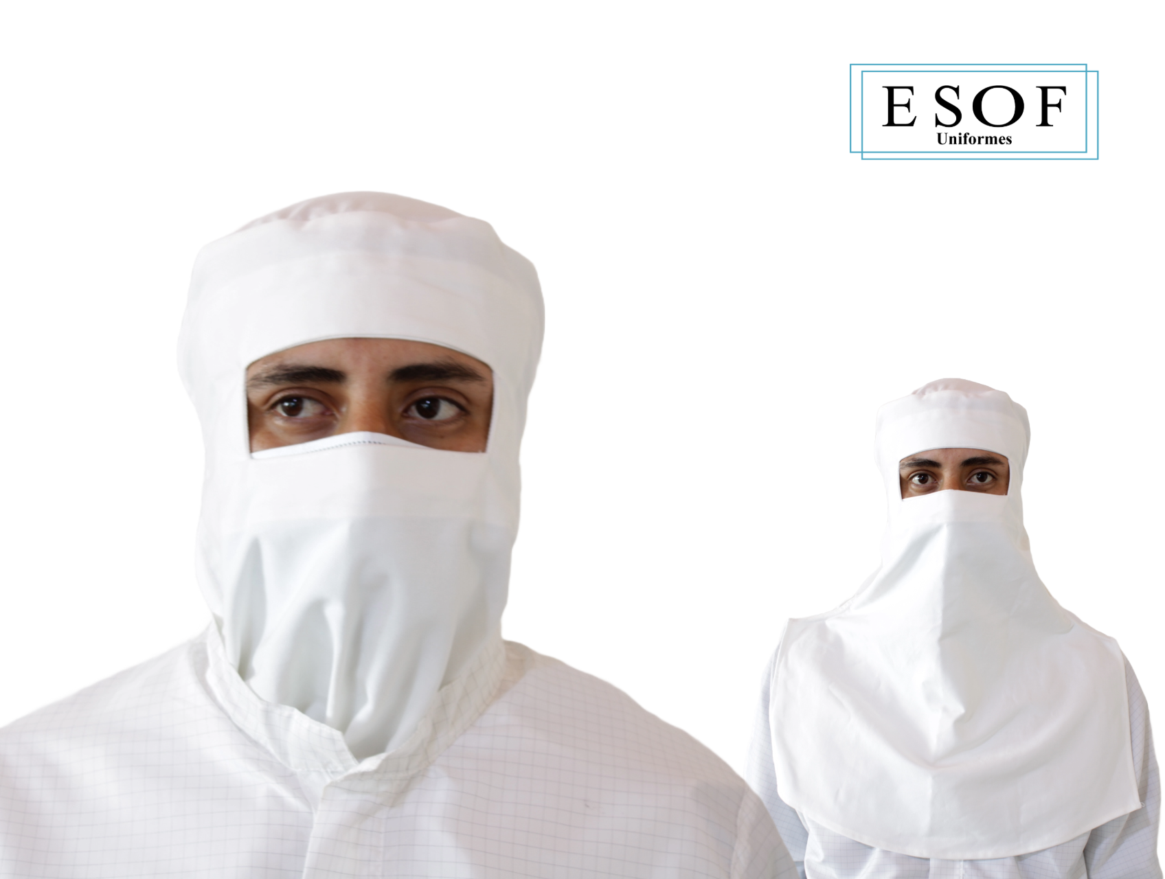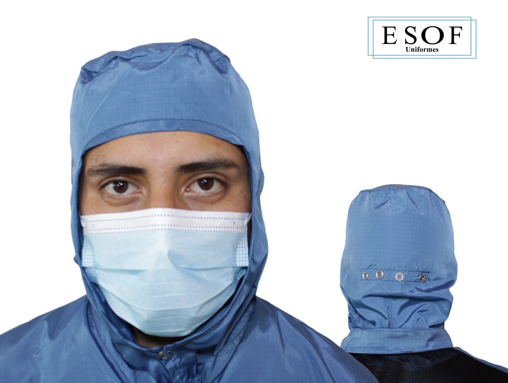 Escafandra con broches de ajuste elaborada en tela antiestática.